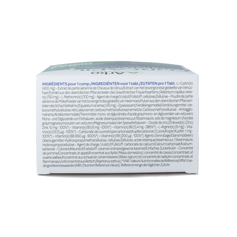 L-cystine, Extract van het bovengrondse gedeelte van Venushaar (Adiantum capillus- veneris), L-methionine, Vulstof: cellulose, Poeder van het bovengrondse gedeelte van Heermoes (Equisetum arvense), Verdikkingsmiddel: vernet carboxymethylcellulose, Antiklontermiddel: mono- en diglyceriden van vetzuren, stearinezuur, magnesiumstearaat, Zinkoxide, Vitamine B5, Vitamine B6, L-arginine, Vitamine D3, Kopercarbonaat, Vitamine B8, Vitamine B9, Glansmiddelen: hydroxypropylmethylcellulose, cellulose, stearinezuur, Vulstof: calciumcarbonaat, Kleurstof: gewone karamel, Concentraten van appel Malus domestica), zwarte aalbes (Ribes nigrum en radijs (Raphanus sativus).
