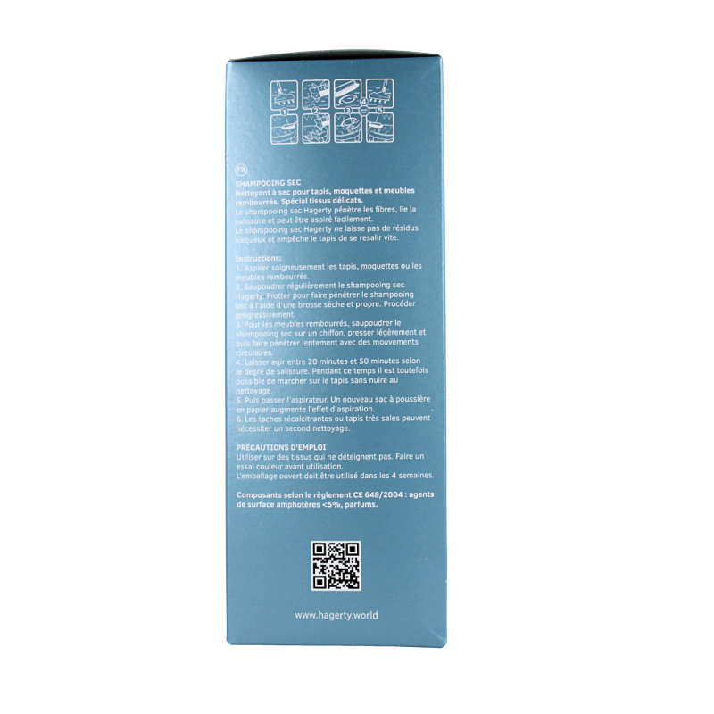 Voor effectieve droogreiniging van tapijt, meubelstof en autobekleding. Strooien, inborstelen en 45 minuten laten inwerken. De droogshampoo gaat een verbinding met het vuil aan en kan daarna moeiteloos worden opgezogen. Hagerty tapijtdroogshampoo laat geen kleverige resten achter en voorkomt snelle hervervuiling. Bevat géén chloorbestanddelen.