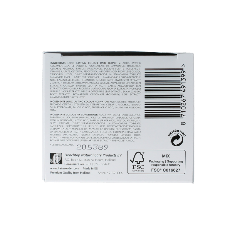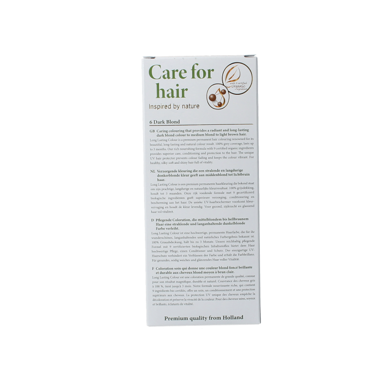 Maar liefst 9 gecertificeerd biologische ingrediënten beschermen de haarstructuur en geven het haar een optimale verzorging en briljante glans. Hierbij wordt kleurvervaging tegengegaan, de haarstructuur versterkt en de kleur optimaal beschermd tegen UV stralen. Biologische Argan olie, Phytokeratine & Provitamine B5 werken haarversterkend, hydraterend en maken het haar zijdezacht. Colour & Care zorgt voor een perfecte grijsdekking en houdt 6 – 8 weken.