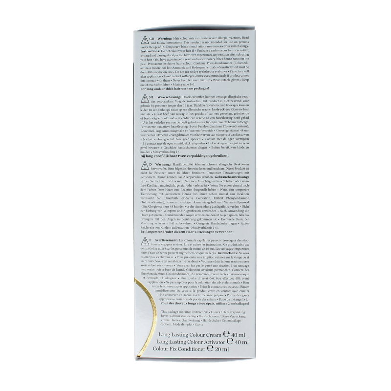 Voer iedere keer dat u uw haar kleurt, 48 uur voor de toepassing een allergie-test uit, ook wanneer al eerder haarkleurproducten zijn toegepast. De test op ca. 1 cm x 1 cm huidoppervlak in de elleboog uitvoeren. Een beetje kleurcrème (tube) met een wattenstokje dun aanbrengen in de elleboog en 45 minuten onbedekt laten inwerken. Tube goed sluiten. Na 45 minuten het product grondig met water van de huid afwassen.