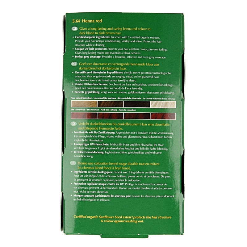 De ultra verzorgende formulering is verrijkt met de fijnste gecertificeerd biologische extracten en conditionerende ingrediënten (onder andere Zonnebloemzaadextract, Rooibos, Groene thee, Ginseng, Hop, Kamille & Rozemarijn) voor gezond, glanzend en fluweel zacht haar. Kleurvervaging wordt tegengegaan, de haarstructuur versterkt en de kleur optimaal beschermd tegen UV stralen. Geniet hierdoor langer van uw haarkleur! Door gebruik te maken van de allernieuwste kleurtechnieken biedt Hennaplus een van de laagste dosering ammonia op de markt, met behoud van een optimaal kleurresultaat.