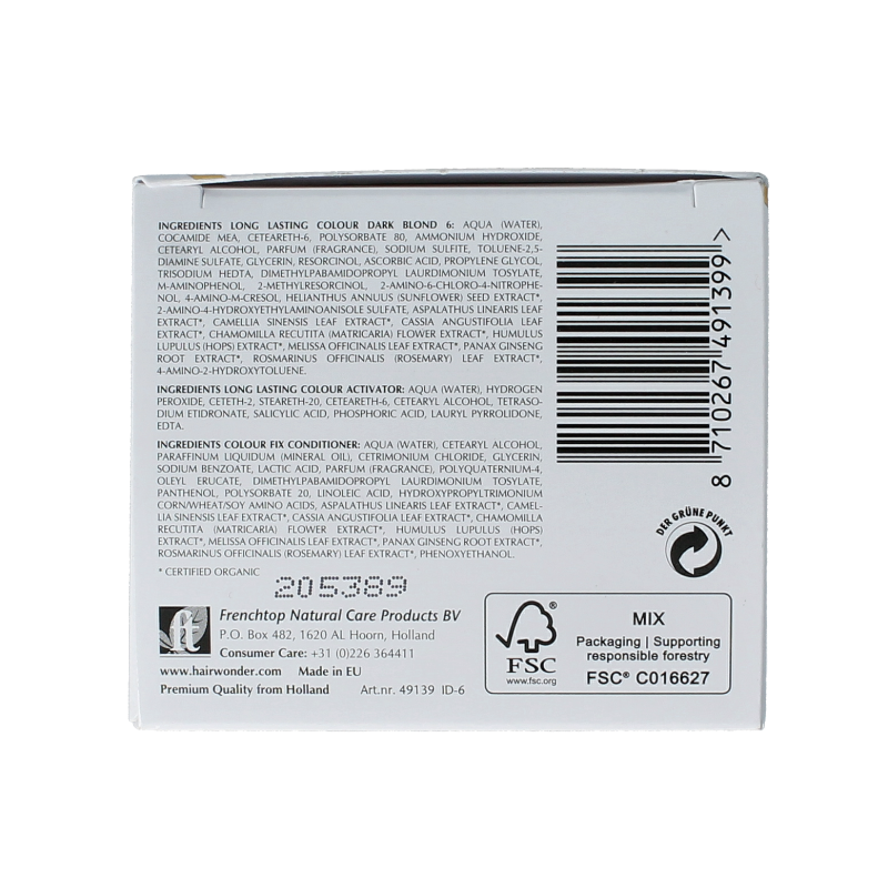 De ultra verzorgende formulering is verrijkt met de fijnste gecertificeerd biologische extracten en conditionerende ingrediënten (onder andere Zonnebloemzaadextract, Rooibos, Groene thee, Ginseng, Hop, Kamille & Rozemarijn) voor gezond, glanzend en fluweel zacht haar. Kleurvervaging wordt tegengegaan, de haarstructuur versterkt en de kleur optimaal beschermd tegen UV stralen. Geniet hierdoor langer van uw haarkleur! Door gebruik te maken van de allernieuwste kleurtechnieken biedt Hennaplus een van de laagste dosering ammonia op de markt, met behoud van een optimaal kleurresultaat.