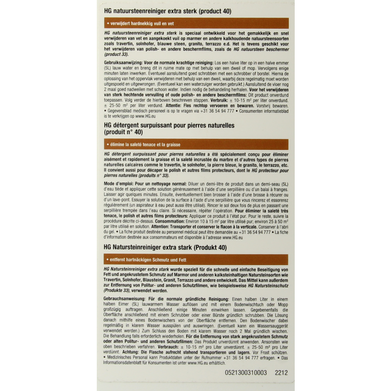 Natuursteen reinigen? HG natuursteenreiniger extra sterk is speciaal ontwikkeld voor het gemakkelijk en snel verwijderen van vet en aangekoekt vuil op marmer en andere kalkhoudende natuursteensoorten.