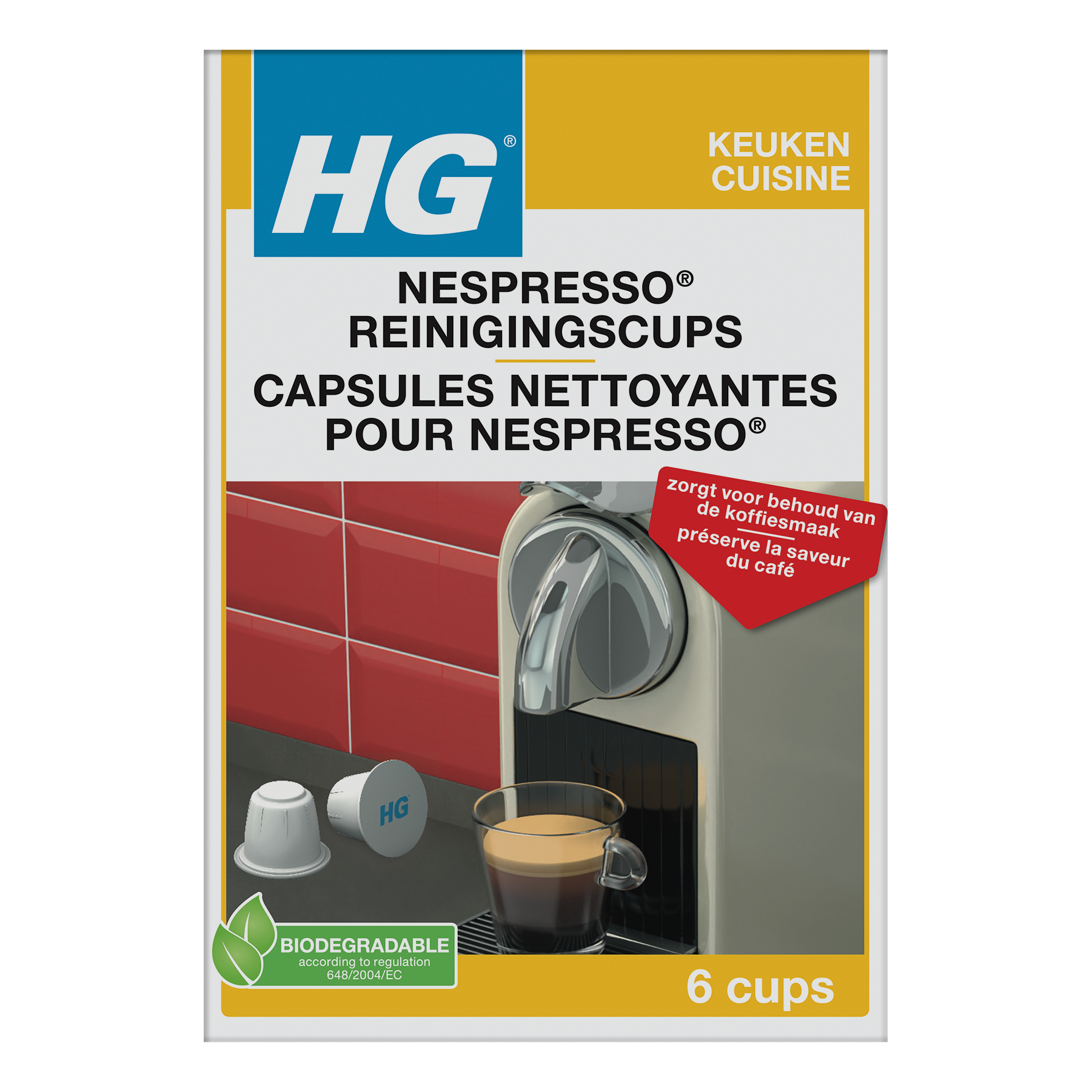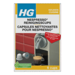 Het met druk zetten van koffie zorgt voor een aanslag van resten koffie en koffievet in het gedeelte van uw Nespresso machine waar de koffie wordt gezet (de zogeheten cuphouder) en in het uitstroompijpje. Elke keer als er koffie wordt gezet, wordt iets van deze aanslag meegenomen door de verse koffie en dit heeft een nadelig effect op de smaak hiervan. Wat erger wordt naarmate de aanslag langer blijft zitten en zich verder ophoopt. Het regelmatig reinigen van de Nespresso cuphouder is daarom van belang. Speciaal hiervoor zijn de HG Nespresso® reinigingscups ontwikkeld.