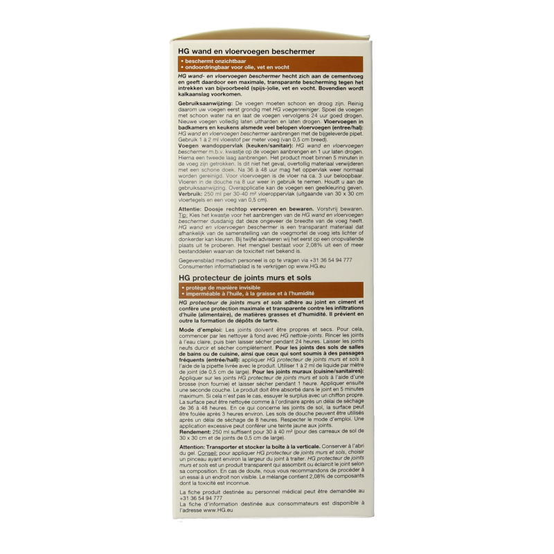 Ook tijdens schoonmaakbeurten dringt het water, dat vuil bevat dat van de vloer of wand afkomt, in de voegen. Hierdoor worden de voegen langzaam maar zeker goor en zijn niet of nauwelijks meer schoon te krijgen. Gelukkig is er HG voegenbeschermer voor maximale, kleurloze en transparante bescherming. 250ml is goed voor zo’n 30 à 40 m² voegoppervlak.
