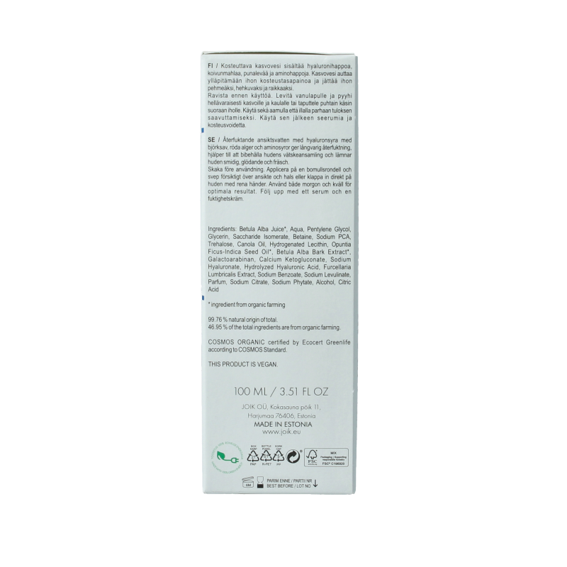 Ontdek de kracht van natuurlijke hydratatie met de JOIK Organic Moisture Magnet Hydrating Facial Toner. Deze unieke toner is verrijkt met hyaluronzuur, berken sap en rode algen, speciaal samengesteld om je huid te revitaliseren en te beschermen. Hyaluronzuur staat bekend om zijn vermogen om vocht vast te houden, waardoor je huid voller en stralender wordt. Berken sap uit Estland, rijk aan antioxidanten, beschermt tegen schadelijke milieufactoren en bevordert celvernieuwing. De rode algen uit Saaremaa zorgen voor een verbeterde elasticiteit en verminderen de zichtbaarheid van fijne lijntjes. Deze toner is geschikt voor alle huidtypen en bereidt je huid perfect voor op verdere verzorging. Met 99,76% natuurlijke ingrediënten, waarvan 46,95% biologisch, is deze toner niet alleen effectief, maar ook milieuvriendelijk. COSMOS ORGANIC gecertificeerd en vegan, gemaakt met 100% groene energie.