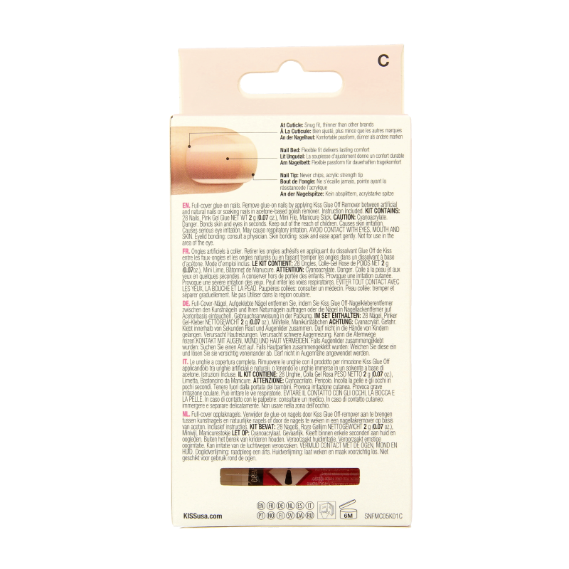 Maak je nagels schoon met nagellakremover en selecteer vervolgens de juiste maat kunstnagels voor iedere vinger. Leg deze apart op de juiste volgorde. Op de nagels staat een nummer aangegeven, waardoor je direct kan zien welk nummer je voor iedere vinger ziet. Wel zo handig als je op beide handen graag dezelfde maten wil. Breng een laagje lijm aan op de achterkant van de kunstnagel en op je eigen nagel. Plaats de kunstnagel op je eigen nagel en zorg dat de kunstnagel mooi tegen de nagelriem aan zit. Druk de nagel erop en houd dit 5 seconden vast. Verwijder het tabje door het naar beneden te buigen en vervolgens omhoog. Tip: breng voldoende lijm aan om lucht tussen de nagels te voorkomen, de hechting te behouden. Waardoor ze langer gedragen kunnen worden.
