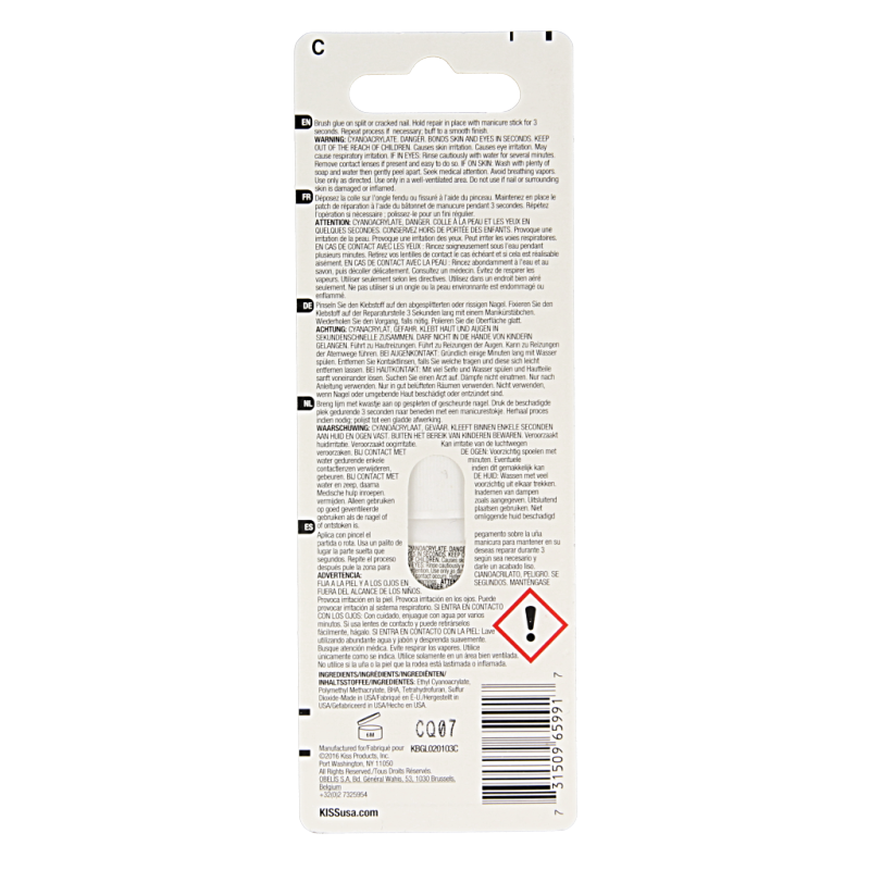 Breng lijm met een kwastje aan op gespleten of gescheurde nagels. Druk de beschadigde plek gedurende 3 seconden naar beneden met een manicurestokje. Herhaal proces indien nodig, polijst tot een gladde afwerking.