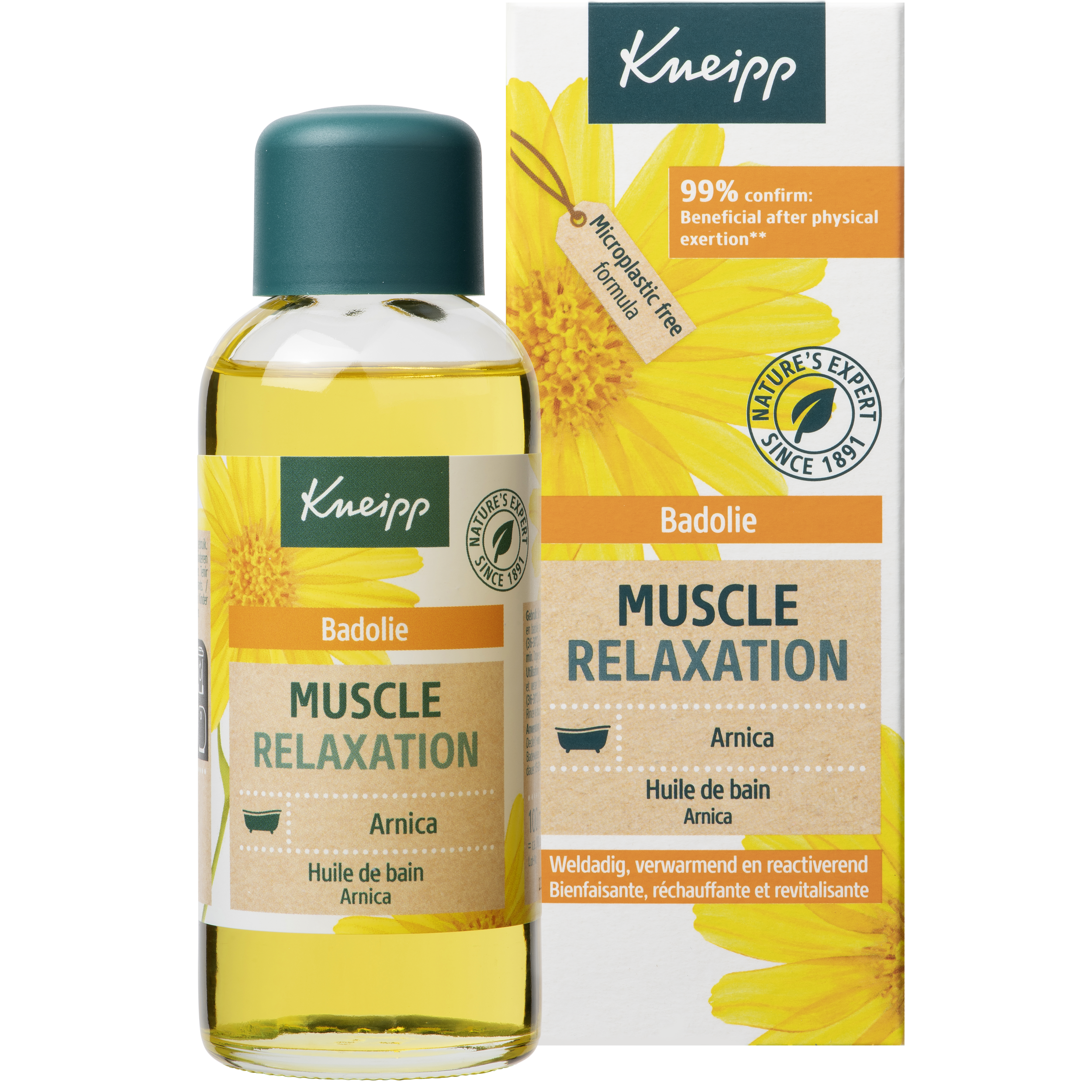 Kneipp® Badolie Muscle Relaxation verwarmt en herstelt spieren en gewrichten weldadig, dankzij een uitgekiende combinatie van natuurlijke plantenextracten en etherische oliën, die een soepele beweeglijkheid bevorderen. **99% van de testpersonen bevestigt: Een bad met dit product verkwikt en doet goed na fysieke inspanning. (Gebruikersstudie, instemmingspercentage in %, 75 testpersonen).