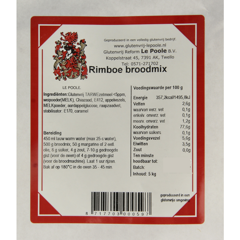 450ml Lauw warm water (max 25°C), 500g broodmix, 50g margarine of 2 eetlepels olie, 8g suiker, 4g zout, 7-10g gedroogde gist (voor de oven) of 4g gedroogde gist (voor de broodmachine). Laat 1 uur rijzen. Bak af op 180°C in de oven 35-45 minuten