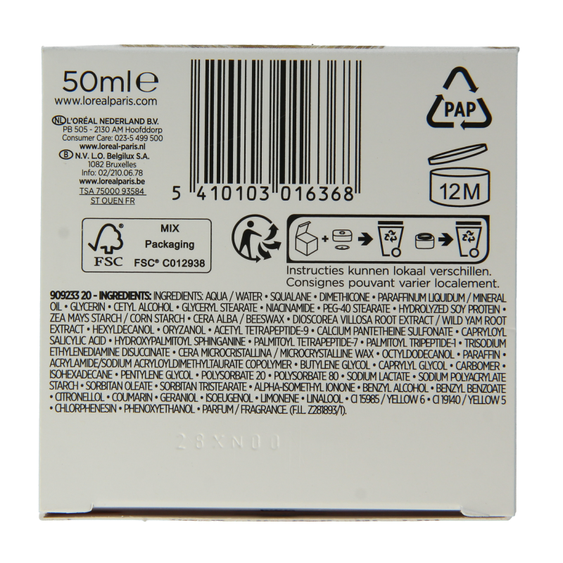 Water, Squalane, Dimethicone, Paraffinum Liquidum / Mineral Oil, Glycerin, Cetyl Alcohol, Stearate, Niacinamide, PEG-40 STearate, Hydrolyzed Soy Protein, Zea Mays Starch / Corn Starch / Corn Starch, Cera Alba / Beeswax, Dioscorea Villosa Root / Wild Yam Root Extract, Hexyldecanol, Oryzanol, Acetyl Tetrapeptide-9, Calcium Pantetheine Sulfonate, Caryloyl Salicylic Acid, Hydroxypalmitoyl Sphinganine, Palmitoyl Tetrapeptlde-7, Palmitoyl Tripeptide-1, Ethylenediamine Disuccinate, Cera Microcristallina / Microcrystalline Wax, Octyldodecanol, Paraffin, Acrylamide/Sodium Acrylamide/Sodium Acryloyldimethyltaurate Copolymer, Glycol Caprylyl Glycol, Carbomer, Isoheadecante, Pentylene Glycol, Polysorbate 20, Polysorbate 80, Sodium Lactate, Sodium Polyacrylate Starch, Sorbitan Oleate, Sorbitan Tristearate, Alpha-Isomethyl Ionone, Benzyl Alcohol, Benzyl Benzoate, Citronellol, Coumarin, Limonene, Linalool, CI 15985/Yellow 6, CI 19140/Yellow 5, Chlorhenesin, Phenoxyethanol,, Parfum/Fragrance (F.I.L. Z281893/1)
