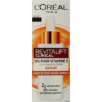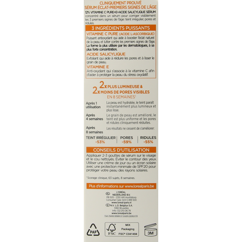 Ontdek het baanbrekende Clinical 12% Pure Vitamine C + E + Salicylzuur Serum van L’Oréal Paris Revitalift. Geformuleerd met pure en stabiele vitamine C in een hoge concentratie. Al bij het eerste gebruik is het Serum effectief tegen dofheid, een ongelijkmatige teint en de eerste tekenen van veroudering. Bevat vitamine E, een actieve stof welke de verhelderende eigenschappen van vitamine C versterkt. Daarnaast helpt vitamine E het salicylzuur met het gladstrijken van de huidtextuur en het verminderen van zichtbare poriën. Het L’Oreal Paris Revitalift Clinical 12% Pure Vitamine C + E + Salicylzuur Serum corrigeert zichtbaar de 3 belangrijke tekenen van vroege veroudering*: ongelijkmatige teint, zichtbare poriën en fijne lijntjes. Geschikt voor alle huidtypes en huidskleuren.