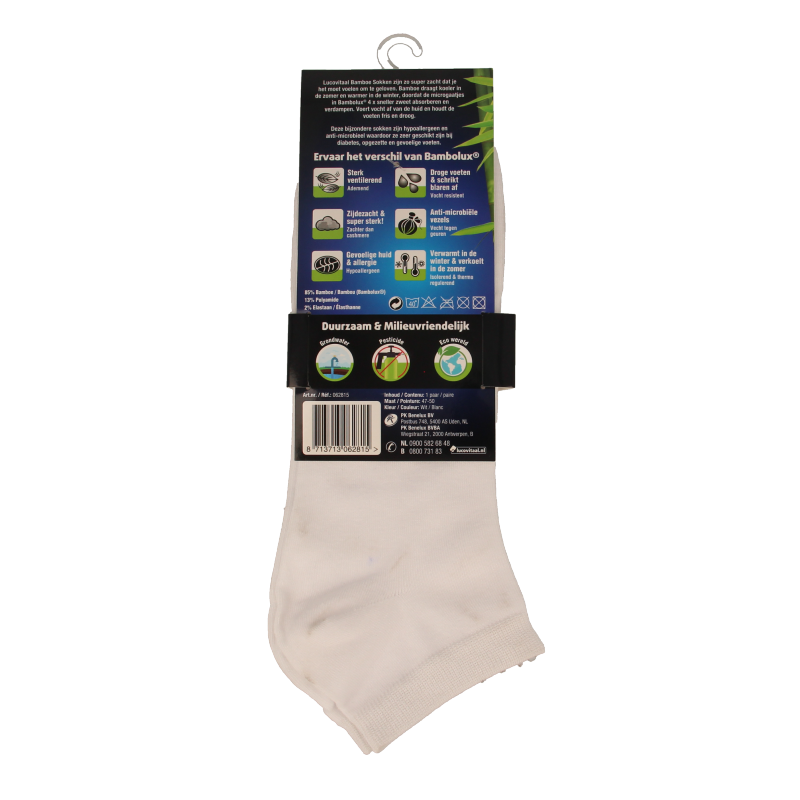 Lucovitaal Bamboe Sokken zijn zo super zacht dat je het moet voelen om te geloven. Bamboe draagt koeler in de zomer en warmer in de winter, doordat de microgaatjes in Bambolux® 4 x sneller zweet absorberen en verdampen. Voert vocht af van de huid en houdt de voeten fris en droog. Deze bijzondere sokken zijn hypoallergeen en anti-microbieel waardoor ze zeer geschikt zijn bij diabetes, opgezette en gevoelige voeten.