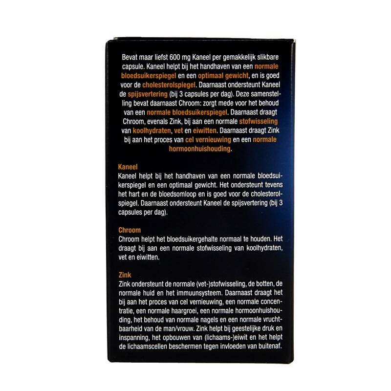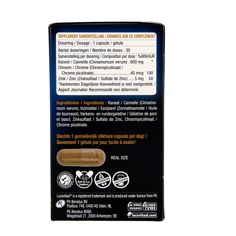 Kaneel (Cinnamomum verum), Vulmiddel (Zonnebloemolie), Varkens- en rundergelatine, Zinksulfaat, Chroompicolinaat.