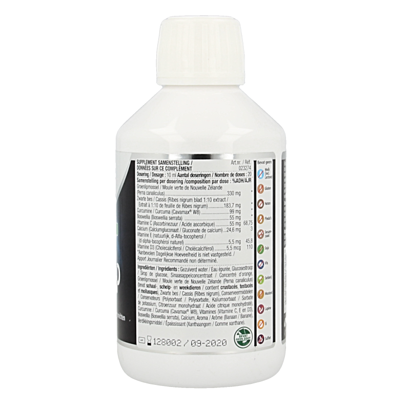 Gezuiverd water, Glucosestroop, Sinaasappelconcentraat, Groenlipmossel (Perna canaliculus) (bevat schaal-, schelp- en weekdieren), Zwarte bes (Ribes nigrum), Conserveermiddelen (Polysorbaat, Kaliumsorbaat, Citroenzuur monohydraat), Curcumine (Cavamax® W8), Vitamines (Vitamine C, E en D3), Boswellia (Boswellia serrata), Calcium, Aroma (Banaan), Verdikkingsmiddel (Xanthaangom).