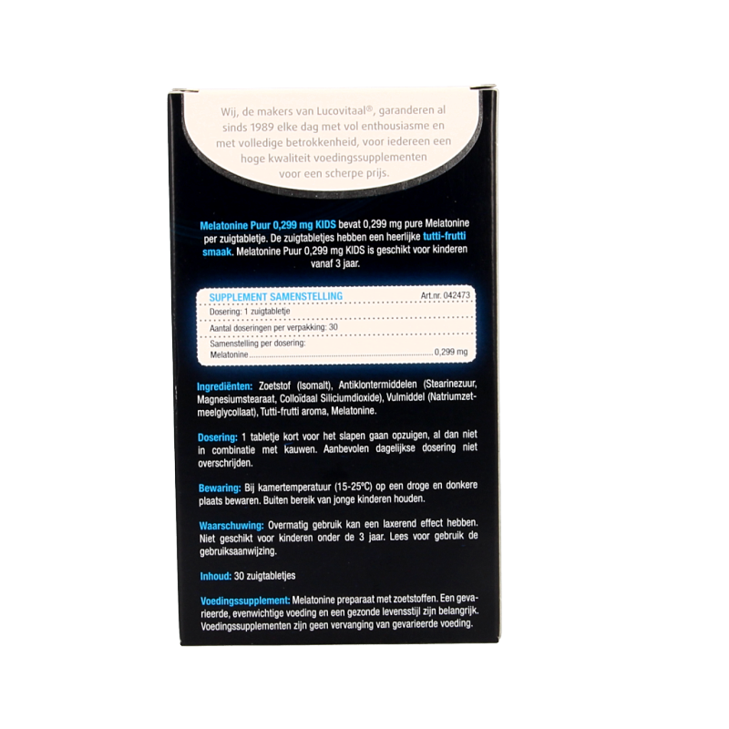 Zoetstof (isomalt), antiklontermiddelen (starinezuur, magnesiumstearaat, colloidaal siliciumdioxide), vulmiddel (natriumzetmeelglycollaat), tutti-frutti aroma, melatonine.
