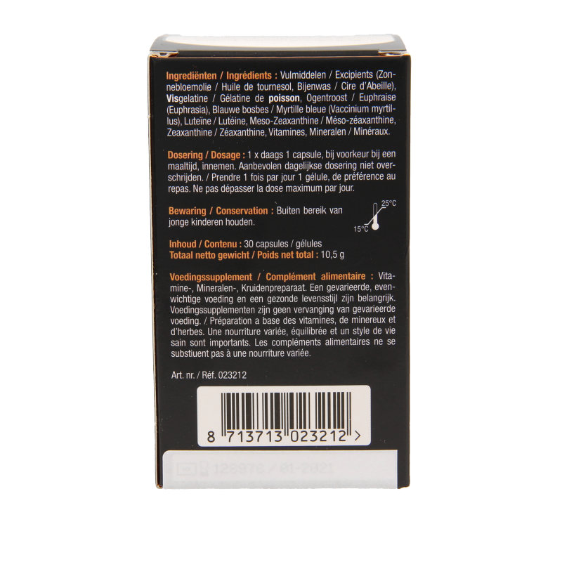 Vulmiddelen (Zonnebloemolie, Bijenwas), Visgelatine, Ogentroost (Euphrasia), Blauwe bosbes (Vaccinium myrtillus), Luteïne, Meso-Zeaxanthine, Zeaxanthine, Vitamines, Mineralen.