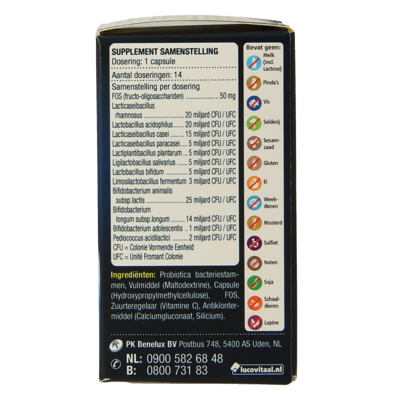 Probiotica bacteriestammen, Vulmiddel (Maltodextrine), Capsule (Hydroxypropylmethylcellulose), FOS, Zuurteregelaar (Vitamine C), Antiklontermiddel (Calciumgluconaat, Silicium).