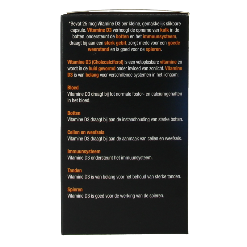 Lucovitaal Vitamine D3, bevat 25 mcg vitamine D3 per kleine, gemakkelijk slikbare capule.