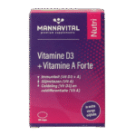 Vitamine D3 + Vitamine A Forte van Mannavital bevat de combinatie van 2 onafscheidelijke vitaminen, die vooral in synergie de weerstand ondersteunen en die in hun best opneembare vorm worden aangeboden. Dit voedingssupplement bevat met 3000 IU vitamine D een werkzame dosis van vitamine D, maar heeft het voordeel ook de “co-partner” van vitamine D aan te bieden: vitamine A. Langdurige inname van vitamine D alleen, kan de werkzaamheid van en de reserve aan vitamine A verminderen.