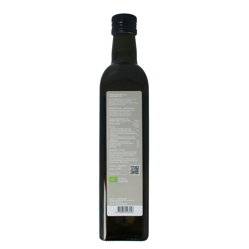Mattisson Organic Olijfolie Extra Vierge is gemaakt van de eerste koude persing van olijven uit Spanje.