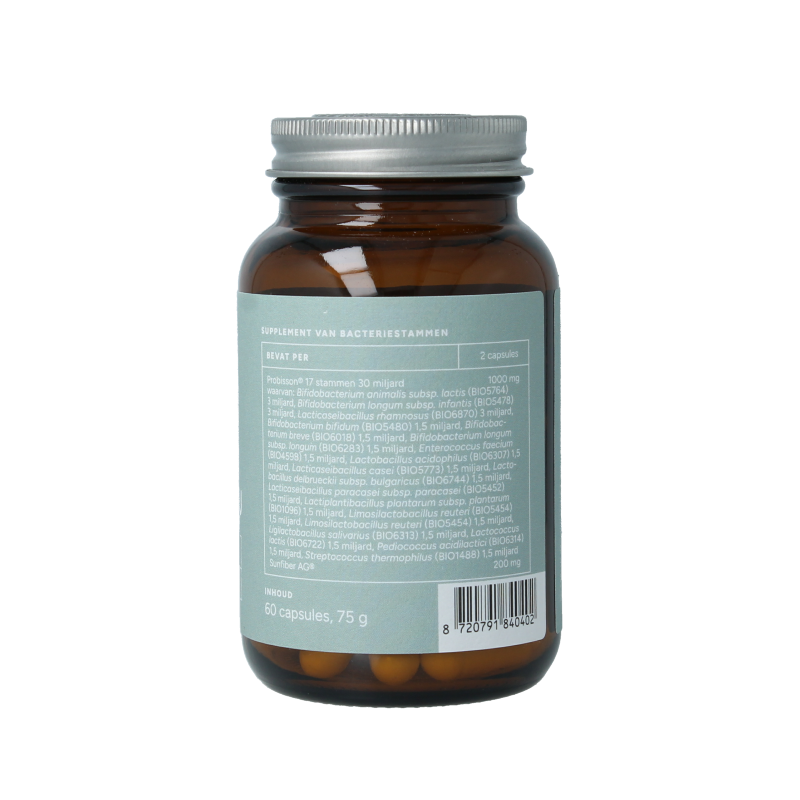 Probisson® (maïs maltodextrine (drager), 30 miljard CFU*/g (17 bacteriestammen)), Sunfiber AG®, HPMC maagzuurresistente vegetarische capsule (huls).