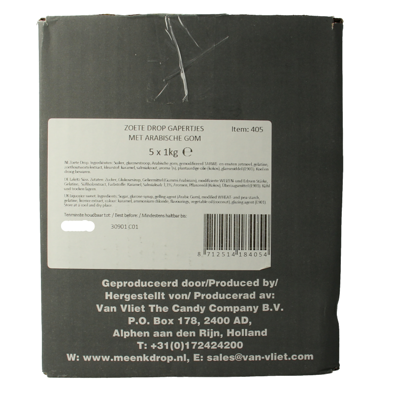 Suiker, Glucosestroop, Arabische gom, Gemodificeerd TARWE- en erwten zetmeel, Gelatine, Zoethoutwortel extract, Kleurstof: Salmiakzout, Aroma(s), Plantaardige olie (kokos), Glansmiddel (E901)