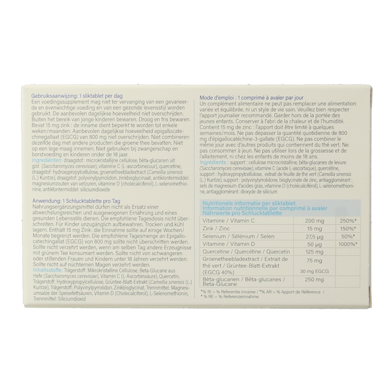 Draagstof: microkristallijne cellulose, bèta-glucanen uit gist (Saccharomyces cerevisiae), vitamine C (L-ascorbinezuur), quercetine, draagstof: hydroxypropylcellulose, groenethee-bladextract (Camellia sinensis (L.) Kuntze), draagstof: polyvinylpyrrolidon, zinkbisglycinaat, antiklontermiddel: magnesiumzouten van vetzuren, vitamine D (cholecalciferol), L-selenomethionine, antiklontermiddel: siliciumdioxide.