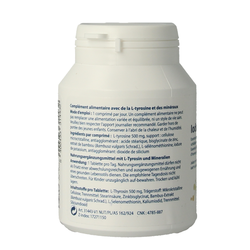 L-Tyrosine, draagstof: microkristallijne cellulose, antiklontermiddel: stearinezuur, zinkbisglycinaat, bamboe-extract bambusa vulgaris Schrad L.), L-selenomethionine, kaliumiodide, antiklontermiddel: siliciumdioxide.