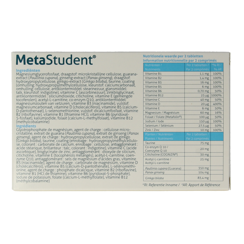 Magnesiumglycerofosfaat, draagstof: microkristallijne cellulose, guarana-extract (Paulinia cupana), ginseng-extract (Panax ginseng), draagstof: hydroxypropylcellulose, ginkgo-extract (Ginkgo biloba), taurine, coating (omhulling: hydroxypropylmethylcellulose, kleurstof: calciumcarbonaat, omhulling: cellulose, antiklontermiddel: stearinezuur, glansmiddel: talk, kleurstof: indigotine), vitamine C (ascorbinezuur), zinkbisglycinaat, antiklontermiddel: siliciumdioxide, citicholine, vitamine E (gemengde tocoferolen), acetyl-L-carnitine, kaliumiodide, co-enzym Q10, antiklontermiddel: magnesiumzouten van vetzuren, vitamine B3 (niacinamide), vulstof: magnesiumcarbonaat, vitamine D (cholecalciferol), vitamine B5 (calciumpantothenaat), L-selenomethionine, vulstof: dicalciumfosfaat, vitamine B2 (riboflavine), vitamine B1 (thiamine hydrochloride), vitamine B6 (pyridoxal-5-fosfaat), folaat (calcium-L-methylfolaat), vitamine B12 (methylcobalamine).