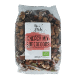 Gedroogd fruit 60% (abrikozen* (abrikozen*, rijstmeel*), dadels* (dadels*, rijstmeel*), vijgen* (vijgen*, rijstmeel*), moerbeien*, cranberries* (cranberries*, appelconcentraat*, zonnebloemolie*)), incabessen* 5%, gojibessen* 5%, zaden 25% (zonnebloempitten*, pompoenpitten*), NOTEN 15% (WALNOTEN*, AMANDELEN*, HAZELNOTEN*)