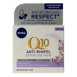 Nivea Q10 Power Anti-Rimpel Verzachtende Dagcrème is speciaal geschikt voor de gevoelige huid. De formule combineert het cel-actieve Q10 met Creatine waardoor effectief fijne lijntjes en rimpels worden verminderd en de huid steviger aanvoelt. Door de toevoeging van Zoethout Extract worden 3 tekenen van een gevoelige huid verminderd: roodheid, droogheid en een trekkigerig gevoel. SPF15 en UVA/UVB bescherming helpen de huid te beschermen tegen rimpelvorming veroorzaakt door zonlicht.