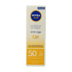 NIVEA SUN UV Gezicht Anti-Age Q10 Crème SPF50 50ml beschermt de gezonde huid van buitenaf tegen huidbeschadiging door UVA/UVB-stralen en tegen effecten van hoog energetisch zichtbaar licht, zoals vroegtijdige huidveroudering. Het helpt de opperhuid ook van binnenuit te beschermen dankzij een krachtige natuurlijke antioxidant die het huideigen afweermechanisme activeert. De formule met Q10 beschermt tegen en helpt het ontstaan van fijne lijntjes, rimpels en pigmentvlekken veroorzaakt door de zon te bestrijden. De hydraterende formule zorgt ervoor dat de huid zacht aanvoelt, wat deze zonnebrandcrème ideaal maakt voor dagelijks gebruik. NIVEA SUN UV Gezicht Anti-Age Q10 Crème SPF50 is 68% biologisch afbreekbaar en respecteert de oceaan door vrij te zijn van UV-filters Octinoxate, Oxybenzone en Octocrylene. Oogvriendelijke formule en oftalmologisch goedgekeurd. Huidvriendelijkheid dermatologisch goedgekeurd. *Volgens OESO of gelijkwaardige methoden.