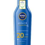 Nivea Sun Protect & Hydrate Hydraterende Zonnemelk SPF 20 biedt direct effectieve UVA/UVB bescherming tegen verbranding door de zon en vroegtijdige huidveroudering. De intensief hydraterende, water resistante formule helpt het risico op huidirritatie door de zon te verminderen . De innovatieve formule helpt de intensiteit van door zonnecrème veroorzaakte vlekken te verminderen na het wassen.