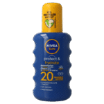 Nivea Sun Protect & Hydrate Hydraterende Zonnespray SPF 20 biedt direct effectieve UVA/UVB bescherming tegen verbranding door de zon en vroegtijdige huidveroudering. De intensief hydraterende, water resistante formule helpt het risico op huidirritatie door de zon te verminderen. De innovatieve formule helpt de intensiteit van door zonnecrème veroorzaakte vlekken te verminderen na het wassen.
