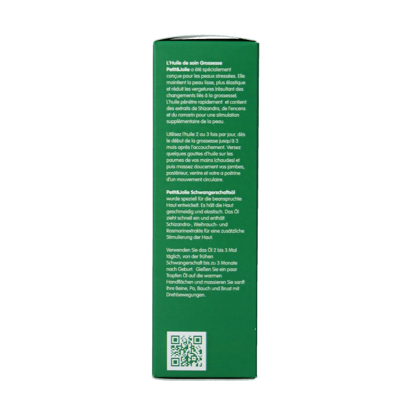 Petit&Jolie Anti Striae Olie is speciaal bedoeld voor de gespannen huid. Het houdt de huid soepel en veerkrachtig en verkleint de kans op striae en zwangerschapsstriemen. De olie trekt snel in en bevat shizandra, wierook en rozemarijn extracten voor een extra stimulans van de huid.