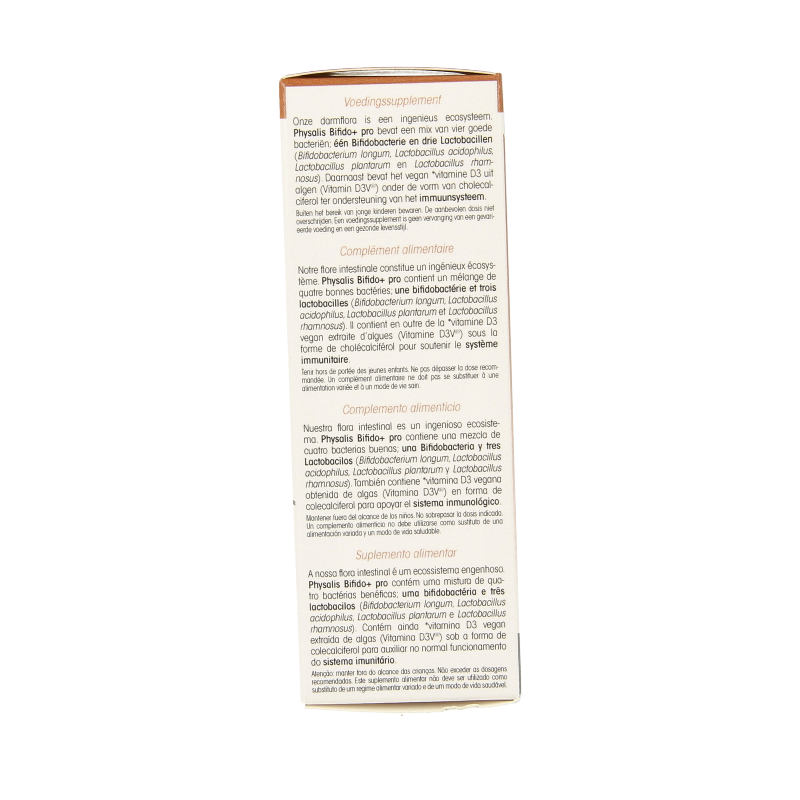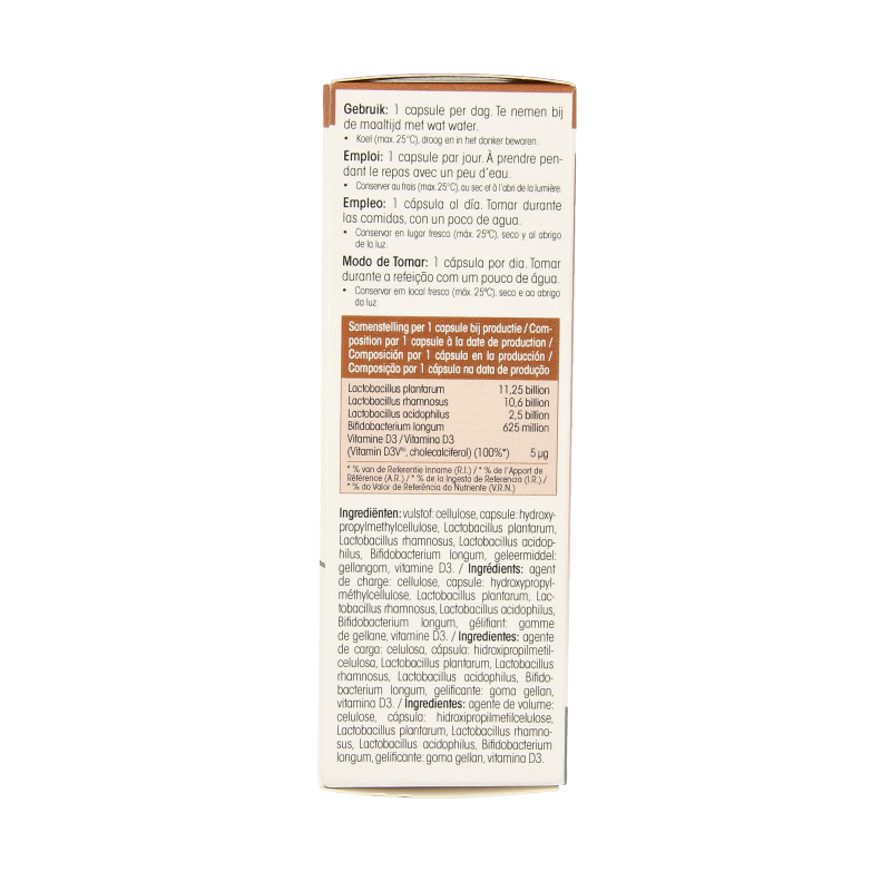 Vulstof: cellulose, capsule: hydroxypropylmethylcellulose, Lactobacillus plantarum, Lactobacillus rhamnosus, Lactobacillus acidophilus, Bifidobacterium longum, geleermiddel: gellangom, vitamine D3.