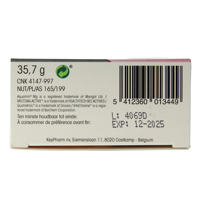 Vulstof: Arabische gom, Aquamin® Mg (magnesiumhydroxide, L-ascorbinezuur, Ijzerbisglycinaat, cholinebitartraat, beta-caroteen, zinkbisglycinaat, D-alfa-tocoferylacetaat, geheel geharde koolzaadolie (brassica nopus), nicotinamide, geleermiddelen: hydroxypropylmethylcellulose, schellak, cholecalciferol, l-selenomethionine, calcium-d-pantothenaat, kleurstof: calciumcarbonaat, koperbisglycinaat, pyridoxal-5″-fosfaat, mangaancitraat, natriumriboflavine-5″-fosfaat, thiamine HCI, kaliumjodide, emulgator: polyethyleenglycol, (6S)-5-methyltetrahydrofoliumzuur, glucosaminezout, biotine, methylcobalamine
