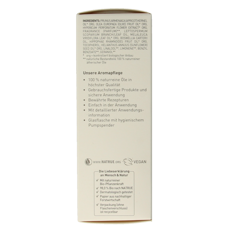 Prunus Armeniaca (Apricot) Kernel Oil* org, Olea Europaea (Olive) Fruit Oil* org, Hypericum Perforatum Flower Extract* org, Fragrance (Parfum)**, Leptospermum Scoparium Branch/Leaf Oil, Melaleuca Viridiflora Leaf Oil* org, Boswellia Carterii Oil, Hippophae Rhamnoides Fruit Oil* org, Tocopherol, Helianthus Annuus (Sunflower) Seed Oil* org, Linalool**, Limonene**, Benzyl Benzoate**, Geraniol**.