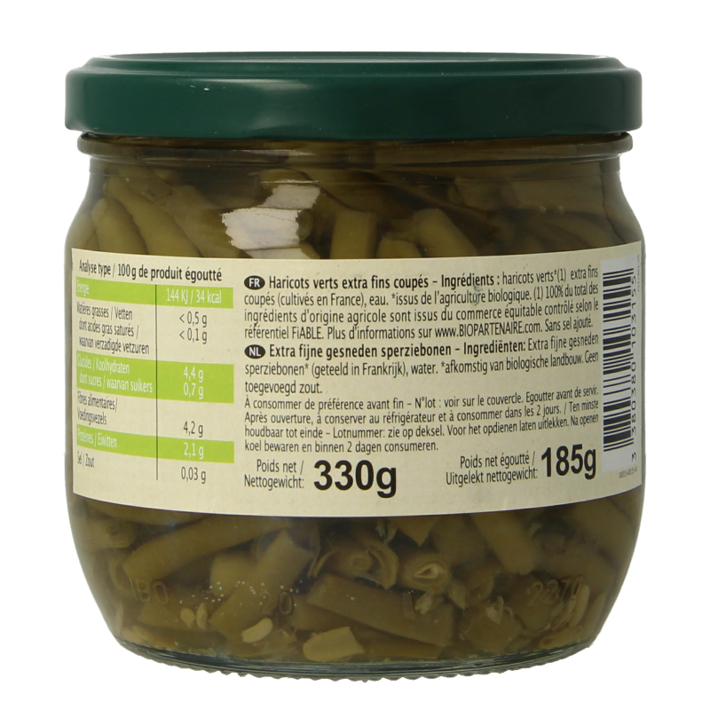 Extra fijne gesneden sperziebonen* (geteeld in Frankrijk), water