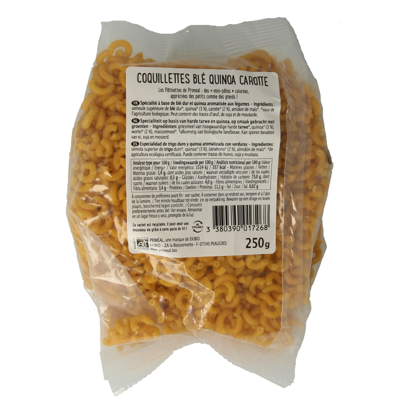 Griesmeel van hoogwaardige harde TARWE* (gluten), quinoa* (3%), wortel* (2%), maïszetmeel*.