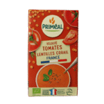 Groenten* herkomst Frankrijk (51%) (gereconstitueerde puree van tomaat* (40%), wortels*, SELDERIJ*, ui*, prei*, courgette*), water, gerehydrateerde rode linzen* (5,2%), rijstzetmeel*, blonde rietsuiker*, zout, extra vierge olijfolie*.