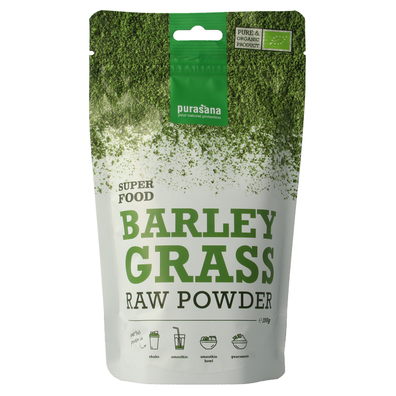 Purasana Barley Grass poeder wordt gewonnen uit jong, vers gerstegras. Na het oogsten wordt het gelijk gedroogd en verwerkt. Hierdoor is het 100% puur, raw en biologisch poeder zonder toevoegingen. Gerstegras poeder is van nature rijk aan vitaminen, mineralen, eiwitten, vezels, chlorofyl (bladgroen) en carotenoiden.