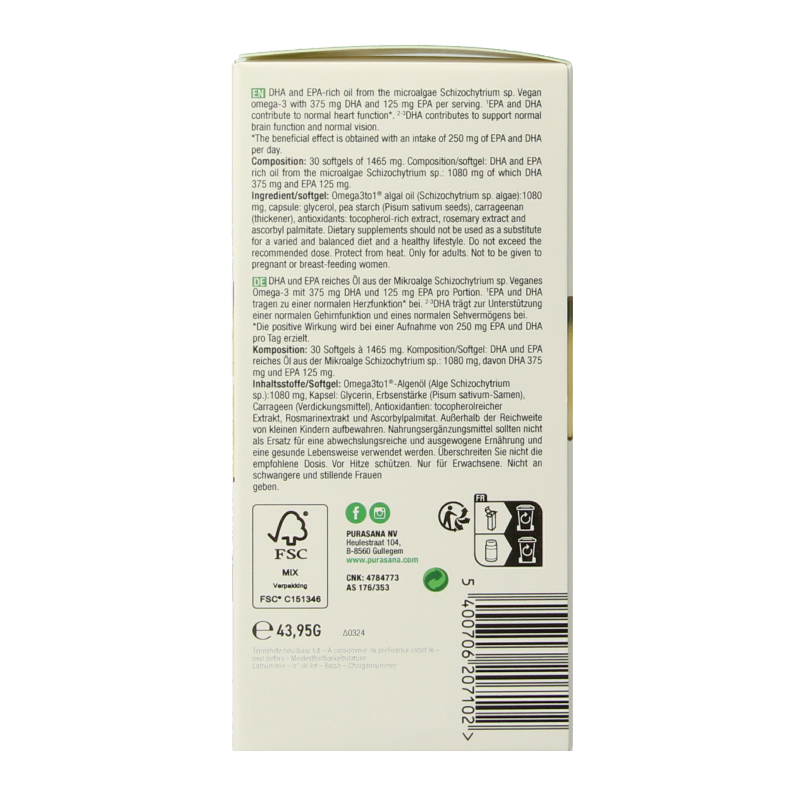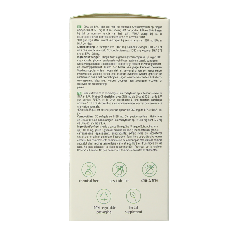 Omega 3to1® algenolie (Schizochytrium sp. alg), capsule: glycerol, erwtenzetmeel (Pisum sativum-zaad), carrageen (verdikkingsmiddel), antioxidanten: tocoferolrijk extract, rozemarijnextract en ascorbylpalmitaat.