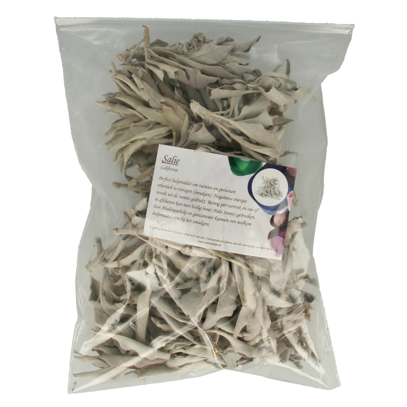 Saliezakje gevuld met 75 gram losse salie. Herkomst is Californië, USA