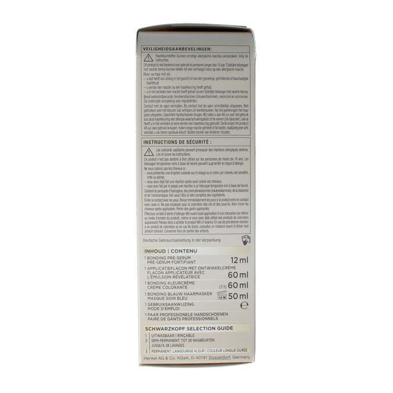 Contact met de ogen vermijden. Bij contact met de ogen onmiddellijk uitspoelen. Niet gebruiken voor het kleuren van wimpers of wenkbrauwen. Na het aanbrengen het haar goed uitspoelen. Geschikte handschoenen dragen. Wij raden aan 48 uur voor het gebruik van deze haarkleuring een allergiewaarschuwingstest uit te voeren (zie bijsluiter), ook al heeft u in het verleden al eerder een haarkleuring gebruikt. Denk eraan het product 48 uur voor gebruik te kopen. Indien enige reactie optreedt of bij twijfel, raadpleeg een arts voordat u uw haar opnieuw kleurt. Buiten bereik van kinderen houden.