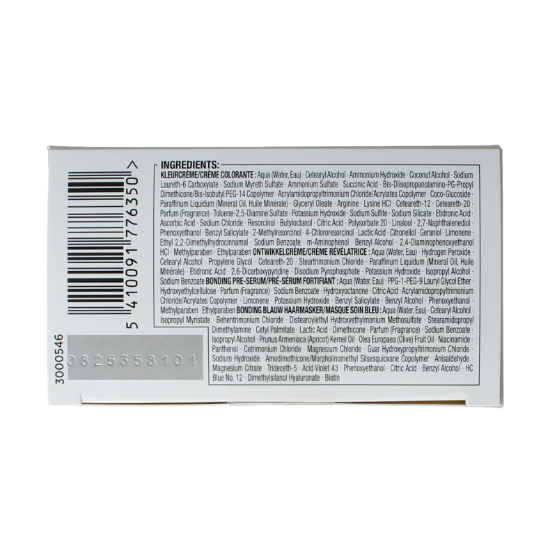 Aqua (Water, Eau), Cetearyl Alcohol, Ammonium Hydroxide, Coconut Alcohol, Sodium Laureth-6 Carboxylate, Sodium Myreth Sulfate, Ammonium Sulfate, Succinic Acid, Bis-Diisopropanolamino-PG-Propyl Dimethicone/Bis-Isobutyl PEG-14 Copolymer, Acrylamidopropyltrimonium Chloride/Acrylates Copolymer, Coco-Glucoside, Paraffinum Liquidum (Mineral Oil, Huile Minérale), Glyceryl Oleate, Arginine, Lysine HCl, Ceteareth-12, Ceteareth-20, Parfum (Fragrance), Toluene-2,5-Diamine Sulfate, Potassium Hydroxide, Sodium Sulfite, Sodium Silicate, Etidronic Acid, Ascorbic Acid, Sodium Chloride, Resorcinol, Butyloctanol, Citric Acid, Polysorbate 20, Linalool, 2,7-Naphthalenediol, Phenoxyethanol, Benzyl Salicylate, 2-Methylresorcinol, 4-Chlororesorcinol, Lactic Acid, Citronellol, Geraniol, Limonene, Ethyl 2,2-Dimethylhydrocinnamal, Sodium Benzoate, m-Aminophenol, Benzyl Alcohol, 2,4-Diaminophenoxyethanol HCl, Methylparaben, Ethylparaben