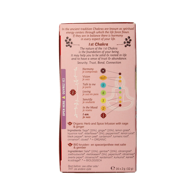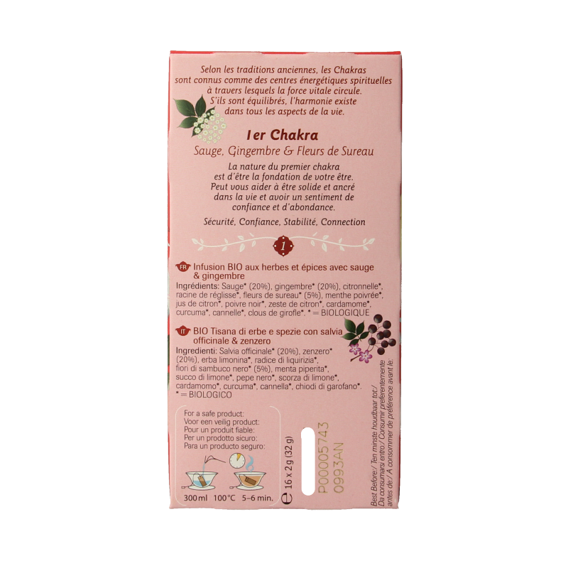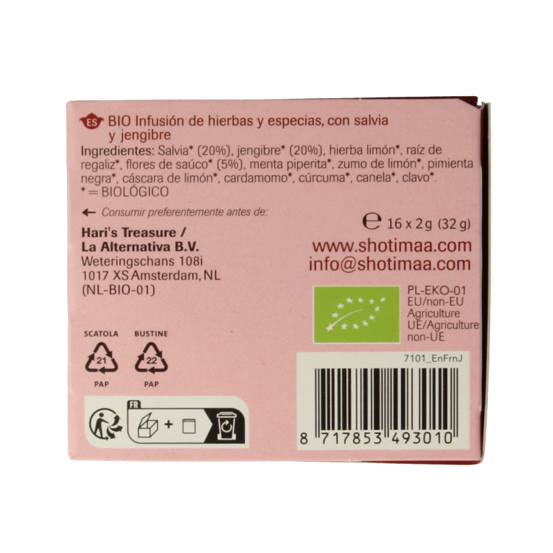Salie* (20%), gember* (20%), citroengras*, zoethoutwortel*, vlierbloesem* (5%), pepermunt*, citroensap*, zwarte peper*, citroenschil*, kardemom*, kurkuma*, kaneel*, kruidnagel*.