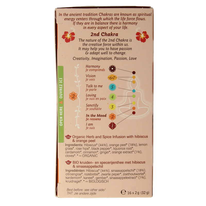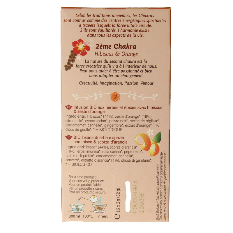 Hibiscus* (44%), sinaasappelschil* (18%), citroengras*, rozebottel*, zwarte peper*, zoethoutwortel*, kardemom*, kaneel*, gember*, sinaasappelextract* (1%), kruidnagel*.