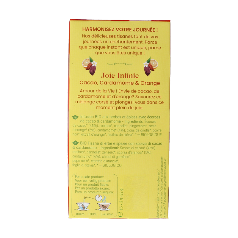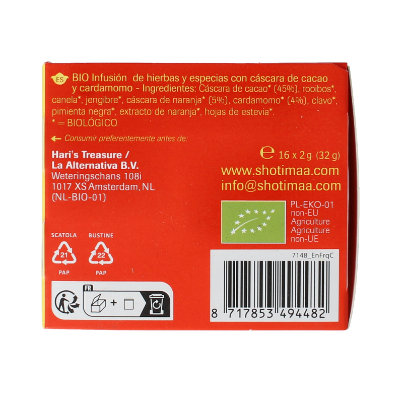 Cacaoschil* (45%), rooibos*, kaneel*, gember*, sinaasappelschil* (5%), kardemom* (4%), kruidnagel*, zwarte peper*, sinaasappelextract*, steviablad*.
